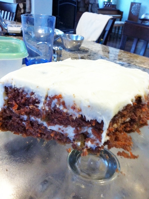 I have two desserts that I know are sure-fire crowd-pleasers.  One is made-from-scratch chocolate cream pie. Labor intensive, rich, dreamy.  The other is carrot cake.  Spicy, carroty, homey, and topped with not-too-sweet cream cheese frosting.