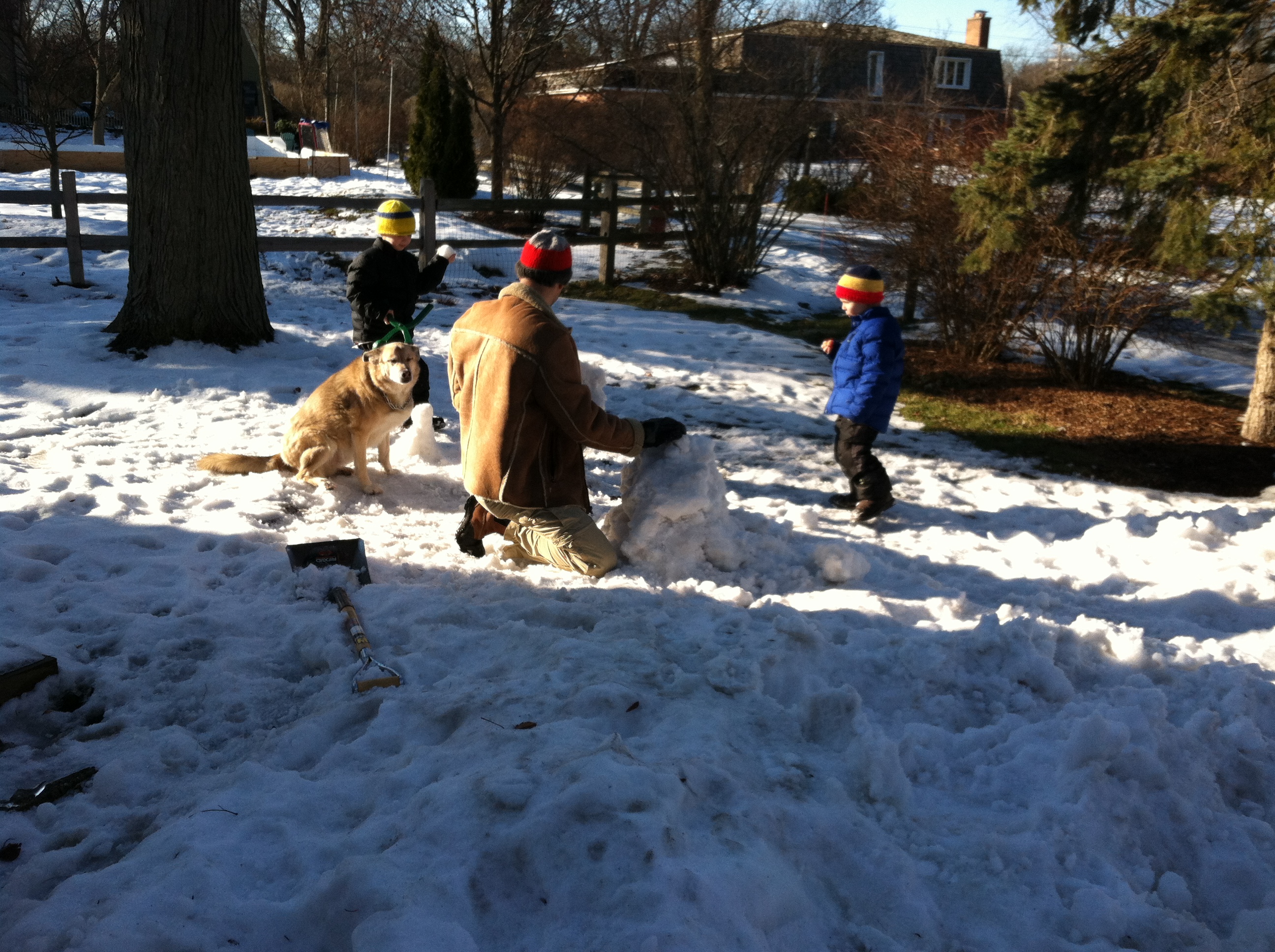 Building a snowman while wearing the ugly hats I knit.