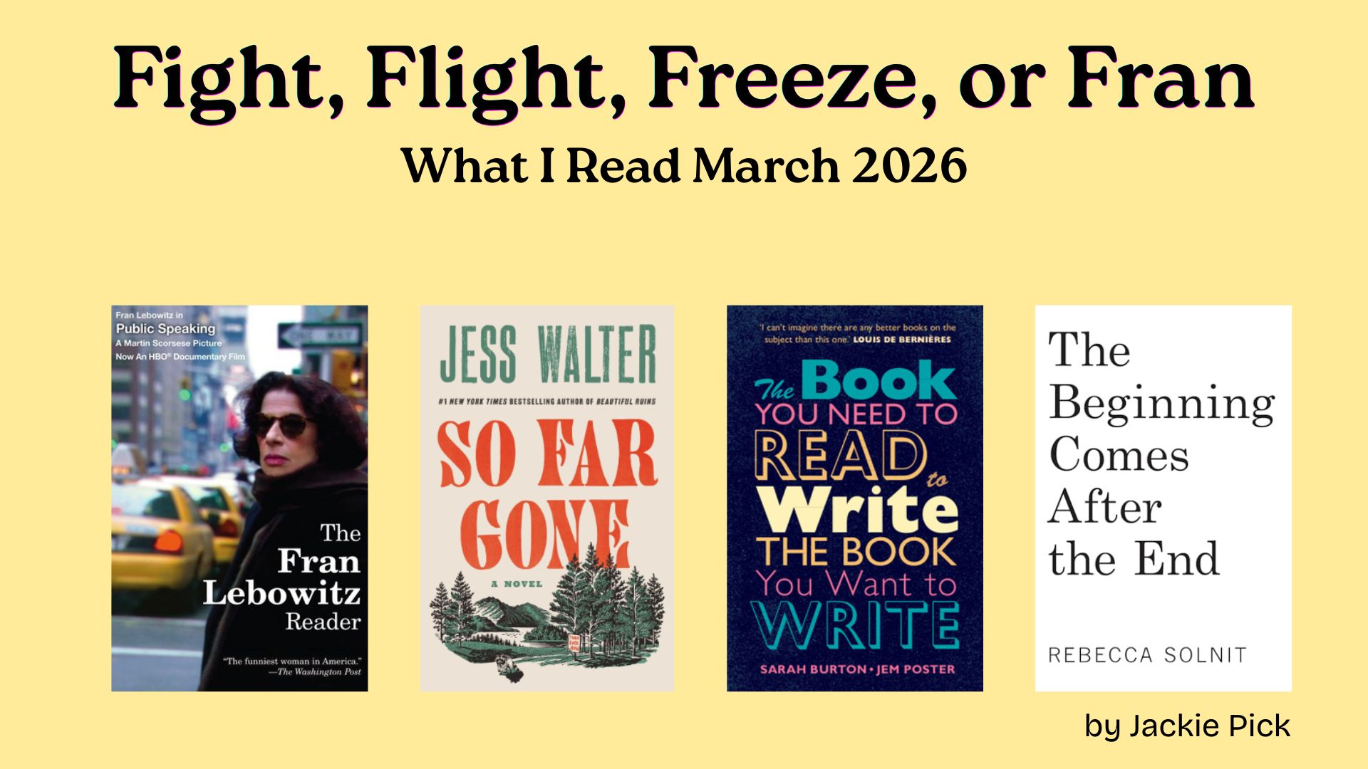 In The Fran Lebowitz Reader, the move is clear: identify the things and make good suggestions for more motivated folks to do something. In So Far Gone, repair is slow, uncomfortable, full of uncomfortable accountability. The Beginning Comes After the End argues that (re)building is the whole plot (and history proves that the necessary work must continue). And The Book You Need to Read to Write the Book You Want to Write dispenses with metaphor entirely and says sit down and get to it.